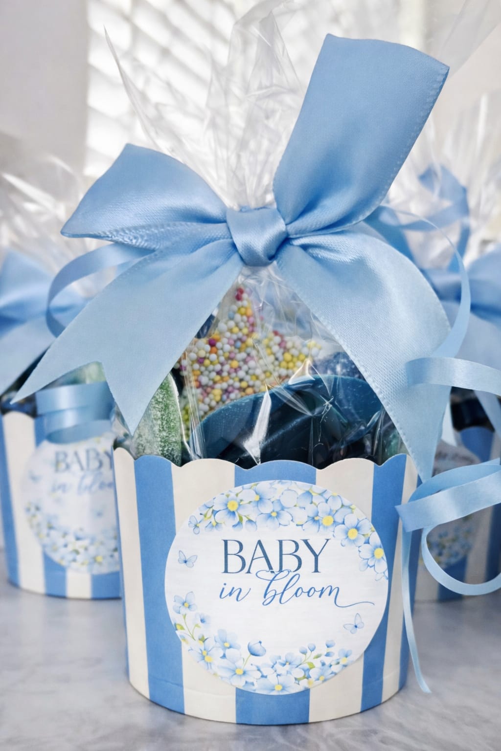 Celebrate a special new arrival with these beautiful baby shower sweet pots, perfectly presented in a striped cup, filled with colourful sweets, and wrapped in clear cellophane with a luxury satin bow. Each pot is finished with a custom personalised label, making them a gorgeous keepsake as well as a delicious treat.