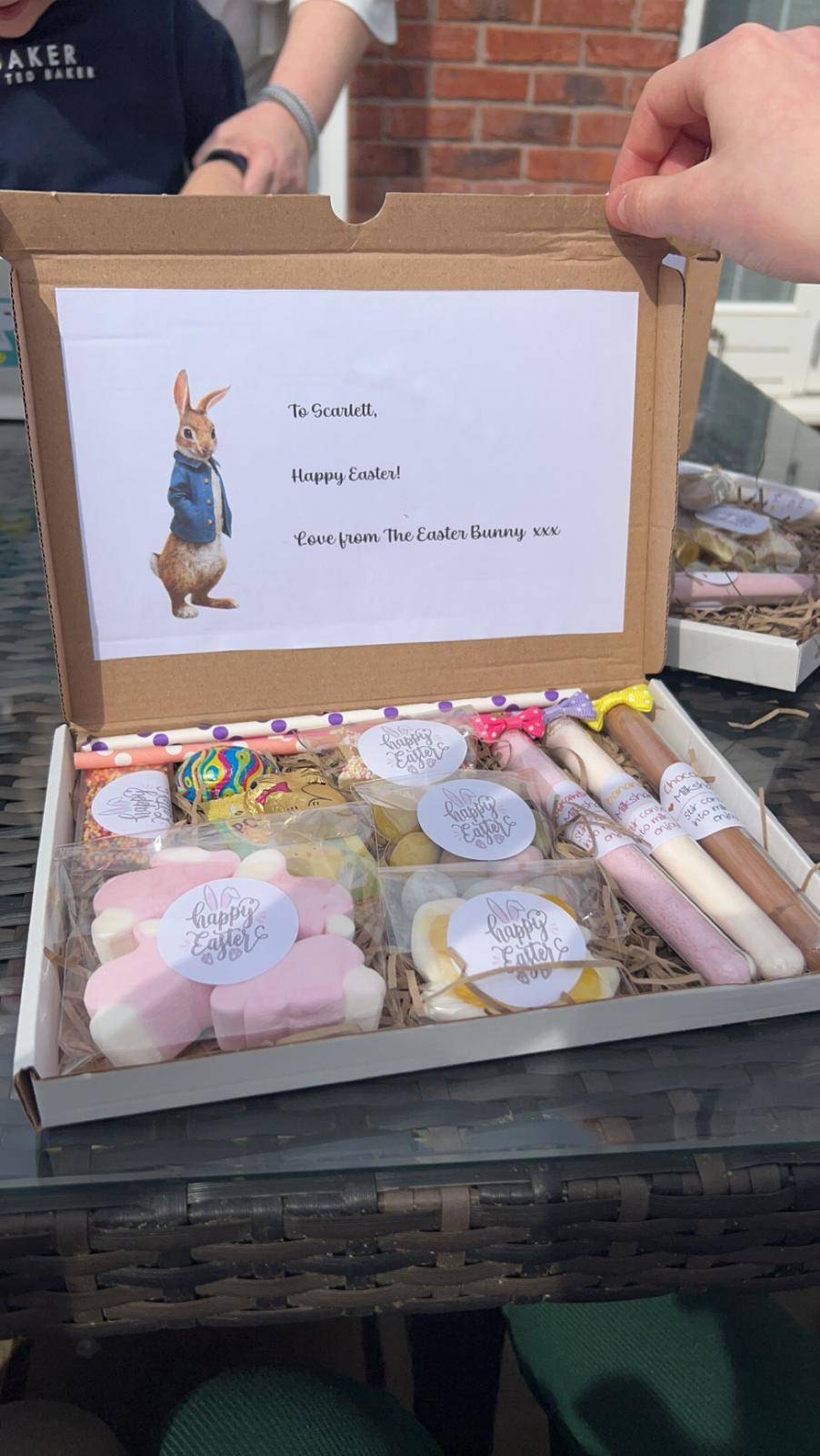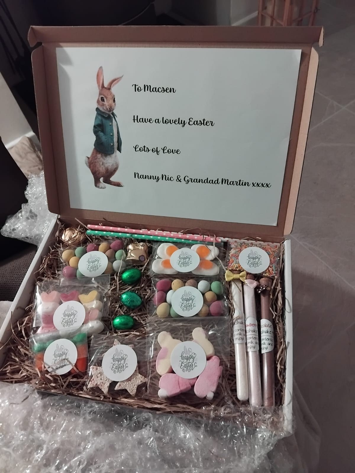 Rachel Parker-EvansAbsolutely five stars !!! Love this seller. Ordered 5 of these beautiful Easter boxes. They are A4 in size and are personalised... Read MoreAbsolutely five stars !!! Love this seller. Ordered 5 of these beautiful Easter boxes. They are A4 in size and are personalised inside with a note and a rabbit picture. I also ordered them last year and they went down an absolute treat. Kids love them. I use them as prizes after the garden egg hunt .Sweets/milkshakes are beautifully wrapped and presented inside the box. And the overall postal packaging is 5 stars. Cannot recommend this seller enough HidePosted on