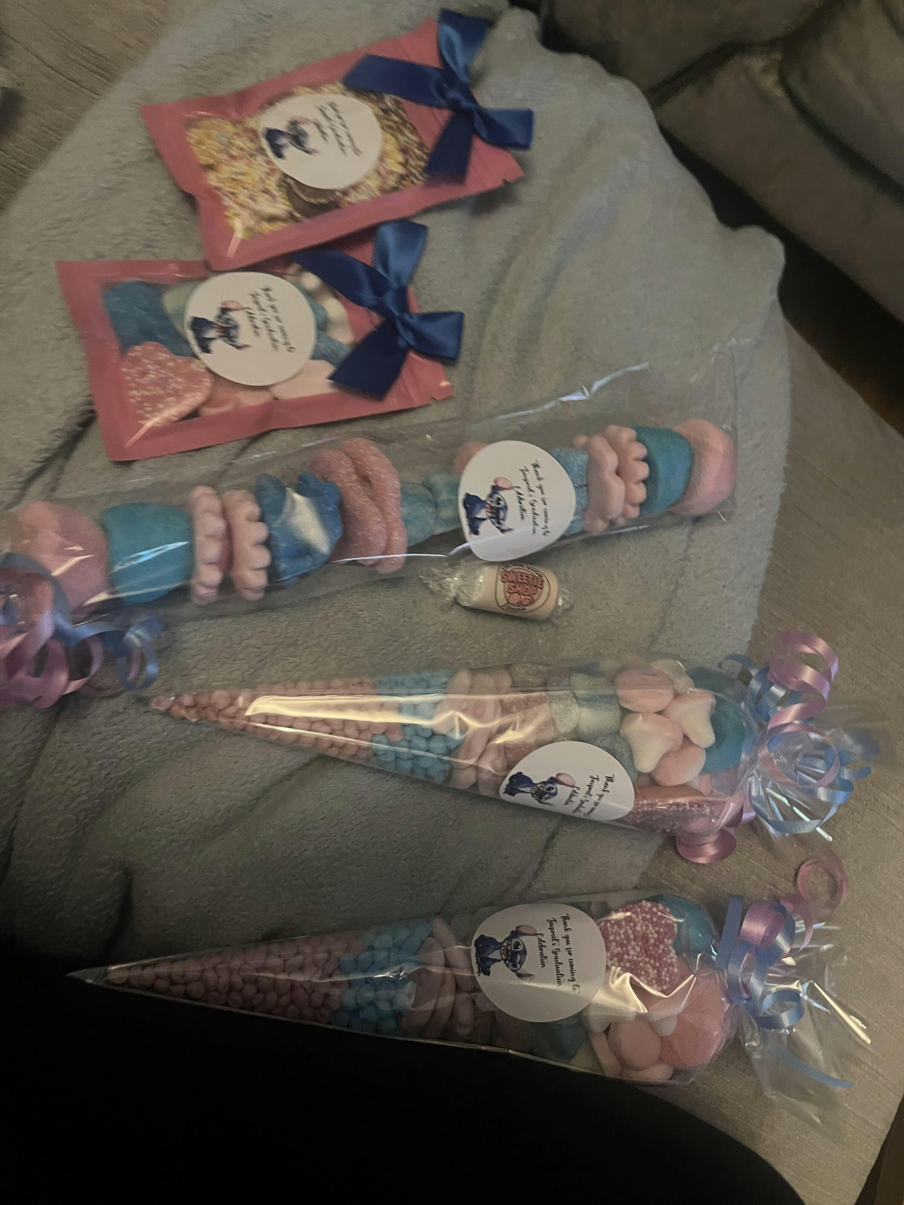 Topped with a personalised sticker and tied with pink and blue ribbon, these delightful treats are perfect for adding a touch of charm to any celebration!